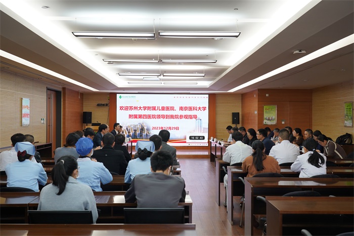 在新年即将到来之际,2023年12月29日,苏州大学附属儿童医院院长王晓东,南京医科大学附属第四医院院长闻浩率专家团队一行14人到临床医学院(附属医院)开展学术交流指导工作,并在医院总院区门诊六楼会议室召开结对帮扶座谈会。学校党委常委、副校长解继胜出席座谈会并讲话,临床医学院(附属医院)党政领导班子成员及相关部门负责人参加座谈。医院党委书记林栩主持座谈会。