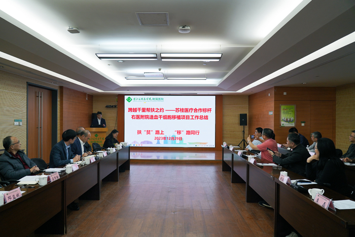 临床医学院(附属医院)党委书记林栩首先代表全院师生员工热烈欢迎苏州大学附属儿童医院王晓东院长、南京医科大学附属第四医院闻浩院长及各位专家莅临医院交流指导,并汇报了医院“一院两区”发展概况,对苏州大学附属儿童医院长期以来对右医附院造血干细胞移植团队和百色周边地贫患儿身心健康的辛勤付出和支持帮助表示衷心感谢。