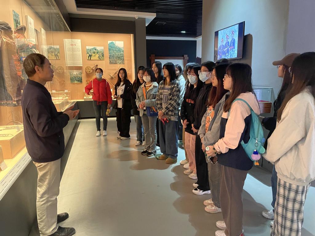 右江民族博物馆属于国家三级博物馆,是广西壮族自治区爱国主义教育和民族团结进步教育基地。馆展主要分有少数民族历史文化和民族民俗文化两大陈列内容。历史文化陈列的主要内容包括百色从80万年前一直延续到近代的乡土历史,基本陈列“百色遗珍”、“千姿百色”,常设“百色旧石器专题展”。全体师生认真参观了展馆内的各个展厅,带教老师还结合场馆内的图片、文字、实物等资料给同学们进行讲解,帮助同学们进一步了解百色少数民族历史文化和民俗文化,每到一个展厅,同学们都驻足认真观看,并积极讨论交流。