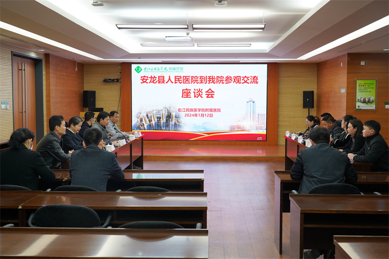 座谈交流会上,蓝常贡副院长代表医院党政领导对贵州省安龙县人民医院同仁们前来共建交流表示热烈欢迎,他希望两家医院在新的一年里继续加大合作交流,共同提升促发展,不断增强两地人民健康福祉。贵州省安龙县人民医院副院长李绍波衷心感谢右医附院长期以来对安龙县人民医院各项事业的支持和帮助,希望在今后继续能够得到右医附院在学科建设、人才培养、医院管理、医疗技术等方面大力帮扶和指导。