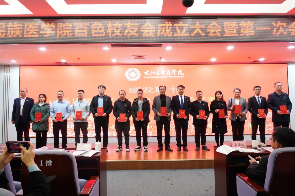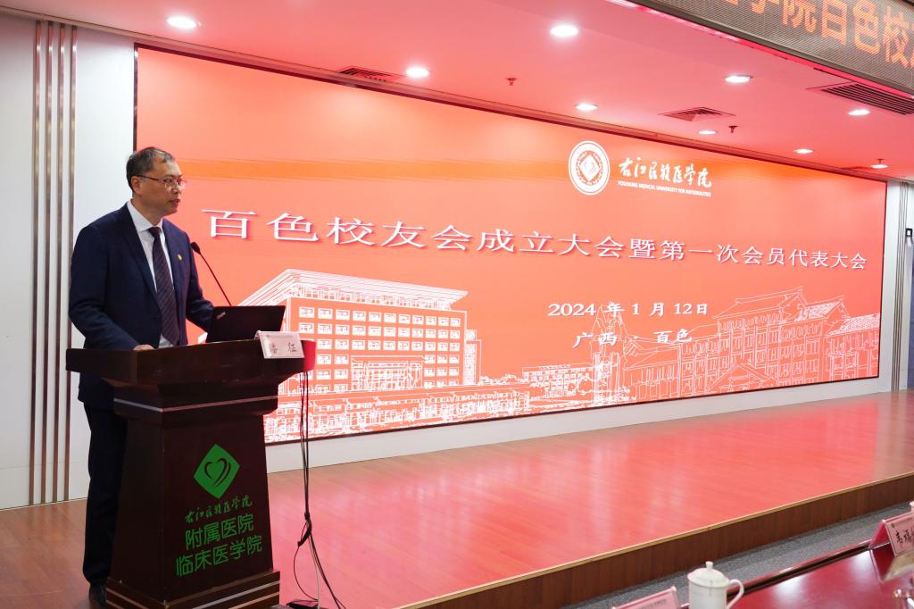 在雄壮的国歌声中,大会拉开帷幕。会上,李雪斌校长代表学校对百色校友会的成立表示热烈祝贺,向校友们介绍了学校近年来取得的成就与发展情况。李雪斌校长指出,当前学校正处在高质量发展的关键时期,百色校友会是学校成立的第一个地方校友分支机构,通过百色校友会的组织、情感纽带,必将能进一步激发广大校友关注和建设母校的热情,有助于团结五湖四海的校友,密切母校与校友之间的交流,增进校友之间的联络沟通,助力学校的发展和校友的事业共同进步。李雪斌校长强调,百色校友会成立后,要在学校校友会的指导下,充分发挥地方校友会的优势,最大程度地团结和凝聚各地、各届校友,扩大校友工作的覆盖面,推动校友会工作的协调、健康发展。李雪斌校长希望广大校友继续关注母校的发展,利用校友会的平台,互相交流、密切联系,努力打造母校与校友之间的事业共同体、情感共同体、文化共同体、命运共同体,弘扬“大医精诚”的校训,让右医精神和学校的优良办学传统在桂西大地上薪火相传、发扬光大。