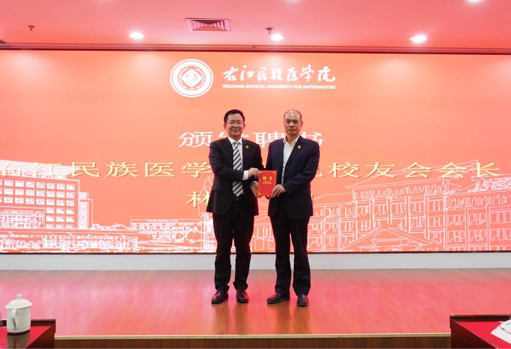 beat365英国官方网站党委副书记、校长李雪斌为新当选的百色校友会会长林栩、常务副会长潘征颁发聘书;林栩会长为副会长、常务理事、秘书长颁发聘书。随后,李雪斌校长、张军副主任、林栩会长、杨发奋副会长、韦福依副会长、陆吉利副会长还共同为百色校友会揭牌。