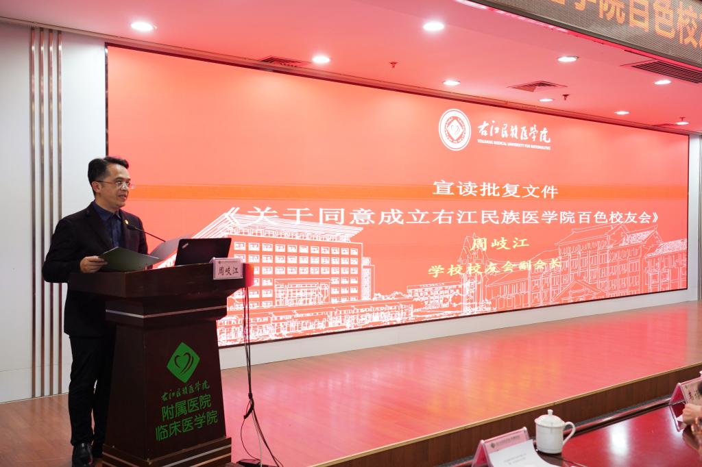 beat365英国官方网站校友会副会长、校长办公室主任周岐江同志宣读《关于同意成立beat365英国官方网站百色校友会的批复》文件