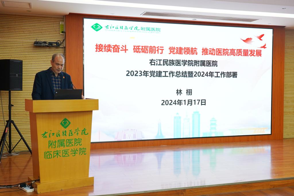 林栩书记指出,在过去的一年里,我院全面加强医院党的政治、思想、组织、作风、纪律建设,把制度建设贯穿其中,思想教育常态化实现强信念;组织建设标准化,实现强体系;双带培养全面化,实现强引领;党建品牌特色化,实现强风采;党建业务一体化,实现强融合;文化建设信念化,实现强服务。全体党员干部职工始终坚持以人民为中心的发展思想,积极履行社会责任,推动形成党的建设和业务工作同频共振、两翼齐飞的良好局面,为百姓健康做出了积极贡献。2024年,林栩书记要求全院上下要继续以党的六大建设为统领,全面加强党对医院的全面领导;要以政治巡视整改为契机,全面促进医院规范化管理;要以全国三级公立医院绩效考核为抓手,全面助推医院高质量发展;要以一流学科专业为目标,提高教育教学能力和效果;要以学校“更大申博”为目标,全面提升医院核心竞争力;要以现代医院管理为引领,助推医院运营管理再上新台阶。