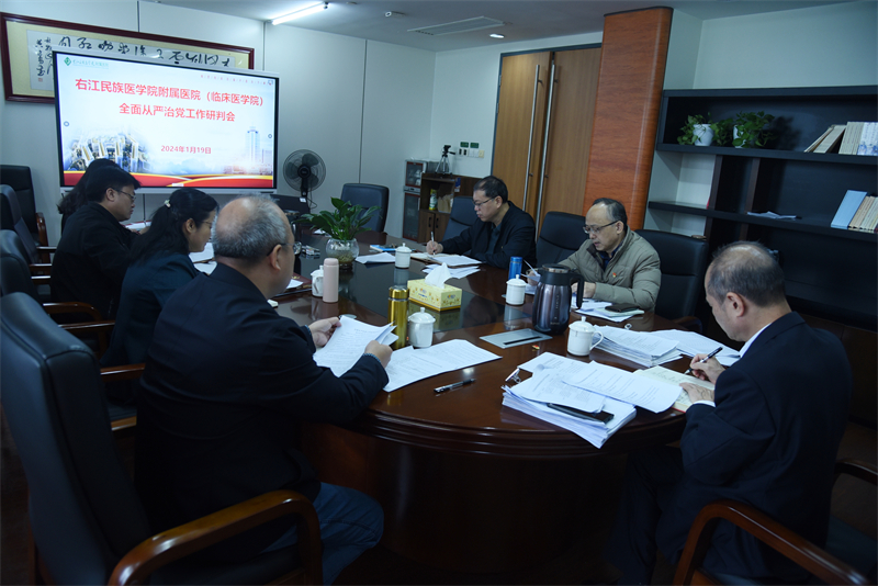 2024年1月19日上午,院党委在总院区门诊五楼会议室召开全面从严治党工作研判会,总结经验、查找不足、剖析原因,并就下一步工作重点进行研究部署。院党委林栩书记、杨发奋副书记、陈文成副书记、潘征副院长、梁楚晗纪委书记、邓益斌副院长、覃灵艳总会计师等参加集中研判。院党委杨发奋副书记主持会议。