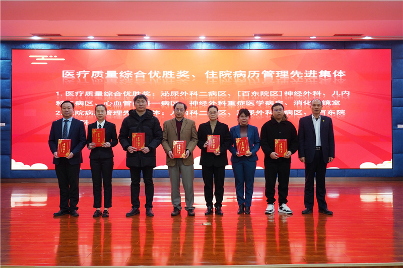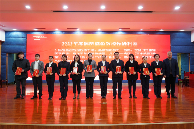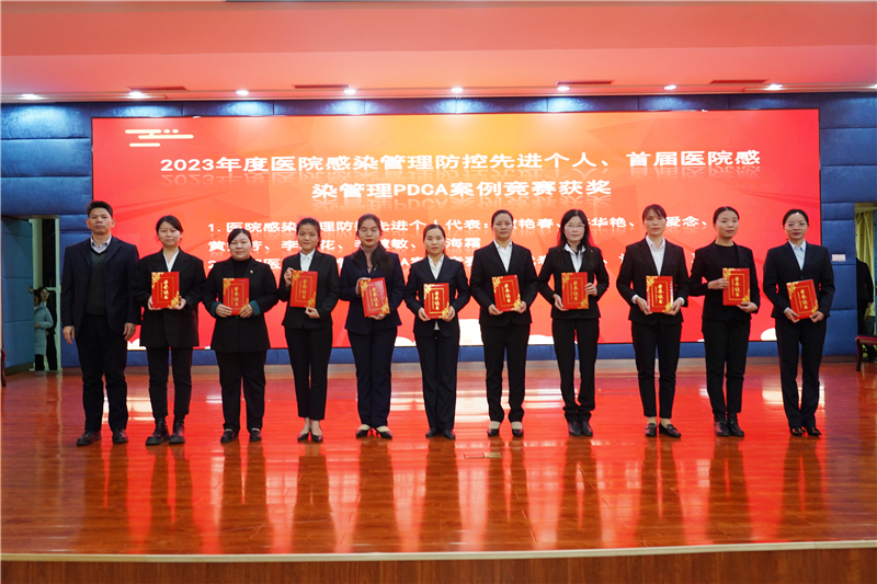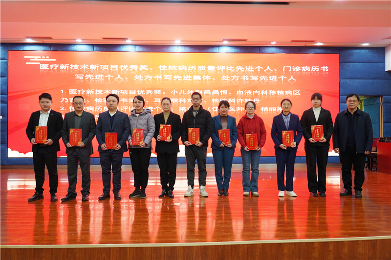 其后,陈文成副书记宣读表彰文件,大会对医疗质量综合优胜奖、住院病例管理先进集体、医疗新技术新项目优秀奖、住院病历质量评比先进个人、门诊病例书写先进个人、处方书写先进个人、医院感染防控先进科室、医院感染管理防控先进个人代表、首届医院感染管理PDCA案例竞赛获奖代表等进行表彰。林栩书记、韦忠恒院长、陈文成副书记、蓝常贡副院长分别为获奖代表颁奖并合影留念。