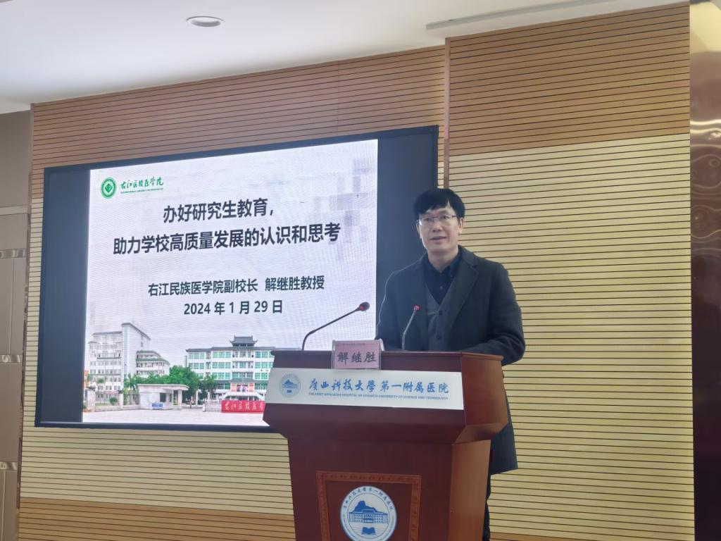 为进一步创新人才培养模式,深化校院合作协同育人。1月29日下午,beat365英国官方网站与广西科技大学第一附属医院硕士研究生联合培养基地揭牌仪式在广西科技大学第一附属医院学术报告厅举行,学校党委常委、副校长解继胜教授,研究生学院院长曾怡教授出席揭牌仪式,同时参加的有广西科技大学党委常委、副校长秦小云教授,广西科大一附院党委副书记、院长覃天教授,副院长、闭雄杰教授等彼方相关工作人员。
