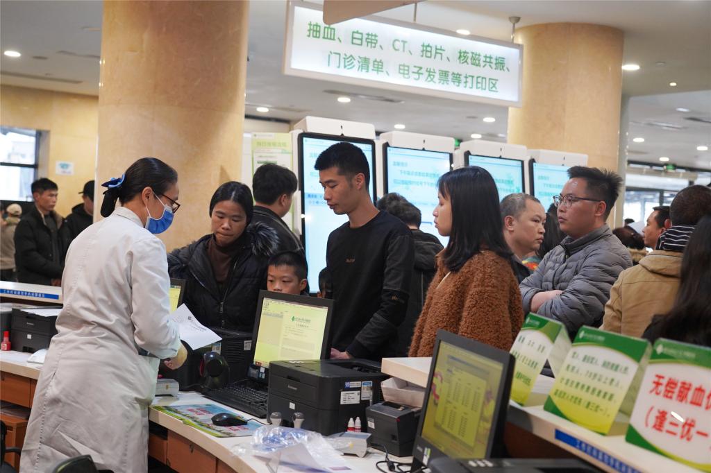 在医院就诊咨询台、一站式服务中心、取药窗口、自助打印区及各个诊室门口等,不少前来就诊人员在排队进行咨询和办理相关手续。面对突增的门诊患者,医院及时安排医护人员、导医等为患者提供解答咨询、引导就医、协助就诊人员挂号等服务,为就医人员提供更高效快捷的服务,不断提高窗口的服务质量和患者的就医体验。
