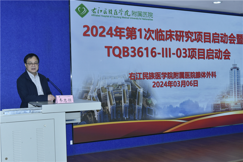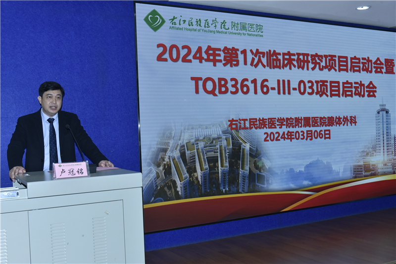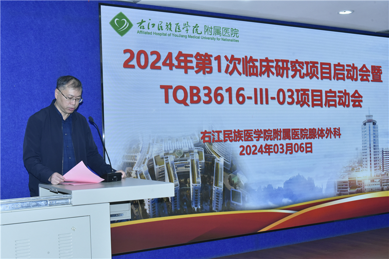 为整体提高临床科研水平,以点带面增强全院学科建设能力,全面规范开展药物临床试验,3月6日上午,临床医学院(附属医院)腺体外科在总院区外科综合大楼5楼大教室召开2024年首次临床研究项目暨TQB3616-III-03项目启动会。临床医学院(附属医院)党委书记林栩、院长韦忠恒出席会议并致辞,副院长潘征主持会议。临床医学院(附属医院)药学部周岐骥副主任(主持全面工作)、医院药物临床试验机构办公室主任何思陆,正大天晴药业集团股份有限公司注册临床运营部经理何学之等相关科室医护人员和药业研究人员参加会议,共同讨论研究相关注意事项、专题培训等。