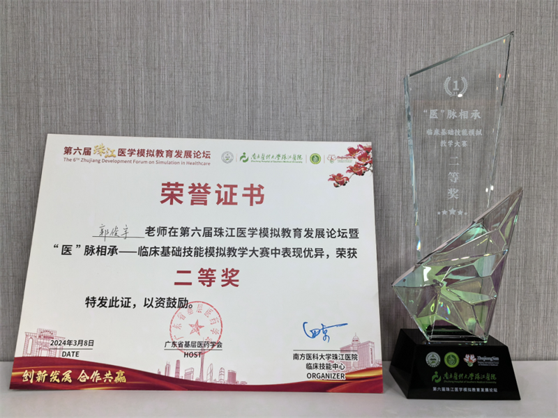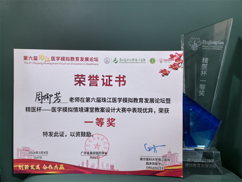 2024年3月8日,正值庆祝“三八”国际妇女节之际,第六届珠江医学模拟教育发展论坛及五大医学模拟大赛在广州顺利举行。赛事前夕,我院临床技能培训中心收到通知,并组织教师进行发展及演练,历时两个月时间,反复修改参赛教案、课件及视频,选派我院代表郭俊宇副教授、周柳芳副教授参加赛事,顺利入围决赛。经过激烈角逐,我院心血管内科周柳芳副教授获医学情境模拟教案设计大赛一等奖,我院肛肠外科郭俊宇副教授获临床基础技能模拟教学大赛二等奖。