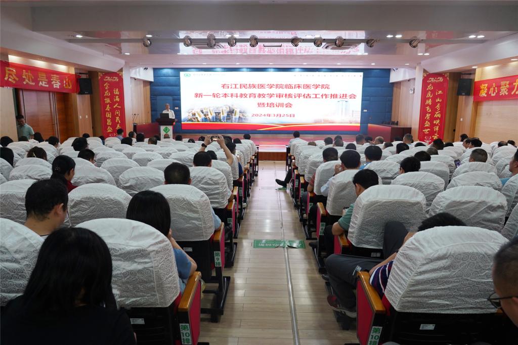 为做好迎接教育部新一轮本科教育教学审核评估专家组入校评估准备工作,确保新一轮审核评估各项任务圆满收官,2024年3月25日晚,beat365英国官方网站临床医学院(附属医院)在总院区学术报告厅召开新一轮本科教育教学审核评估工作推进会暨培训会,对临床医学院(附属医院)本科教育教学工作进行 “诊断把脉”、再动员、再部署。beat365英国官方网站李雪斌校长、王俊利副校长、高等教育研究所黎淑芳所长、审核评估办公室尹毅霞副主任出席会议。beat365英国官方网站临床医学院(附属医院)全体院领导、全院中层干部、教研室主任、教学团队负责人、教研室/教学团队教学秘书、本科教学组长及学工、团委、教务部门工作人员参加会议与培训。beat365英国官方网站临床医学院(附属医院)党委林栩书记主持会议。