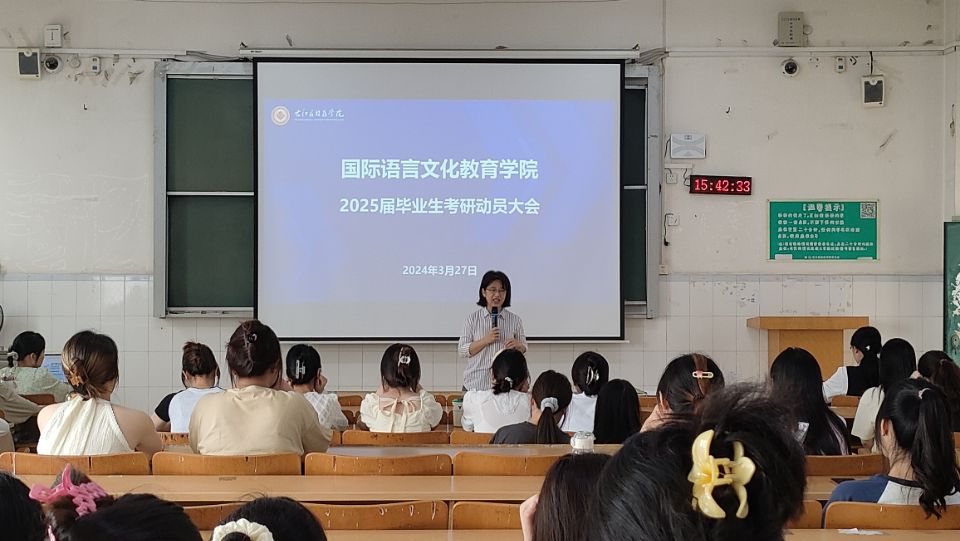 为激发学生考研的热情和动力,推动考研促学风建设,3月27日下午,国际语言文化教育学院在5号综合楼604教室举办了2025届毕业生考研动员大会暨考研经验分享会。会议邀请翻译专业教研室赵海莲老师、2023级翻译硕士研究生吴卓凝、杨靓作为主讲嘉宾。学院党委副书记张剑老师、辅导员蒙丽莎老师出席会议。我院2025届毕业生及其他年级有考研意向的同学参加会议。
