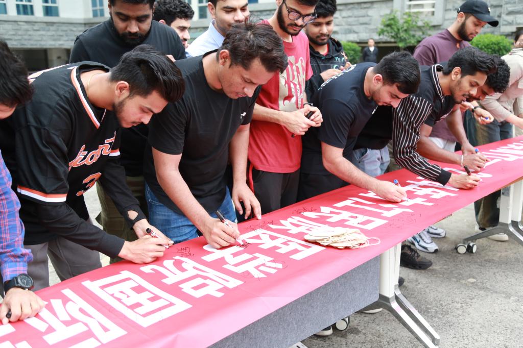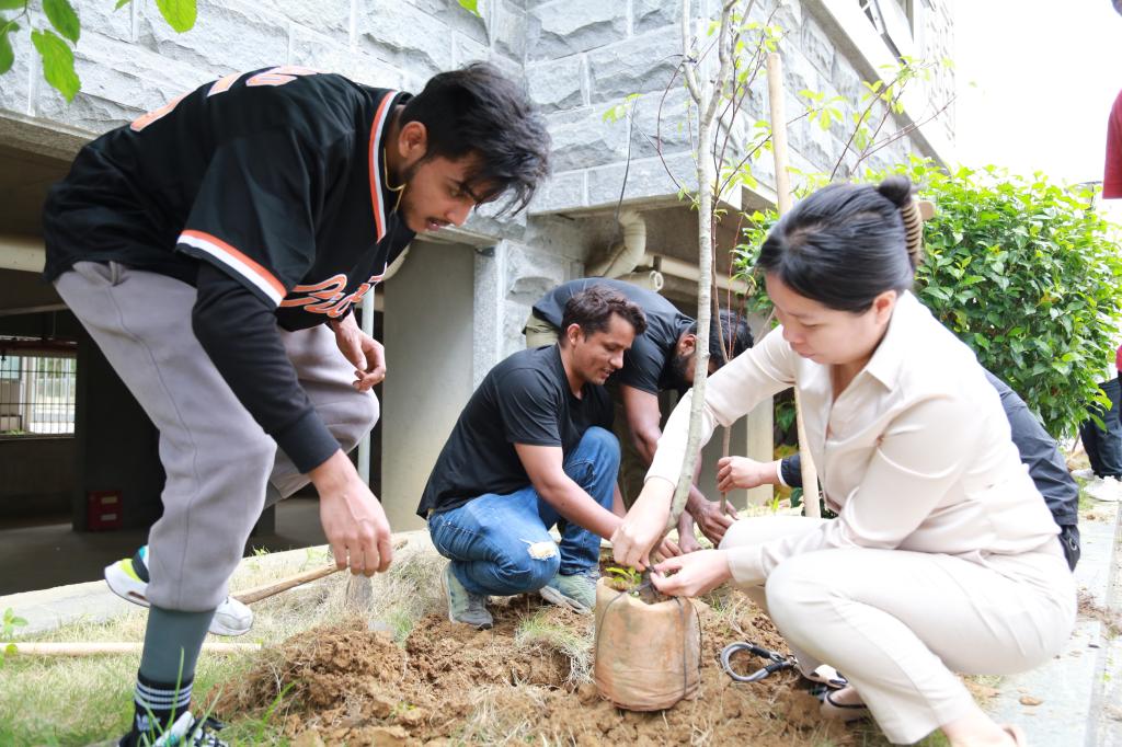 2024年4月7日,为了增强师生的环保意识和生态意识,为学校增添绿色,美化校园环境,国际合作与交流中心党支部、后勤基建处党支部共同在国际学生公寓楼开展“与绿相伴 向美而行”党建带团建主题党日植树活动。参加本次活动的有后勤基建处党支部书记黄敬文、国际合作与交流中心副主任王露瑶、国交中心党支部和后勤基建党支部的老师和即将下点实习的2019级留学生。