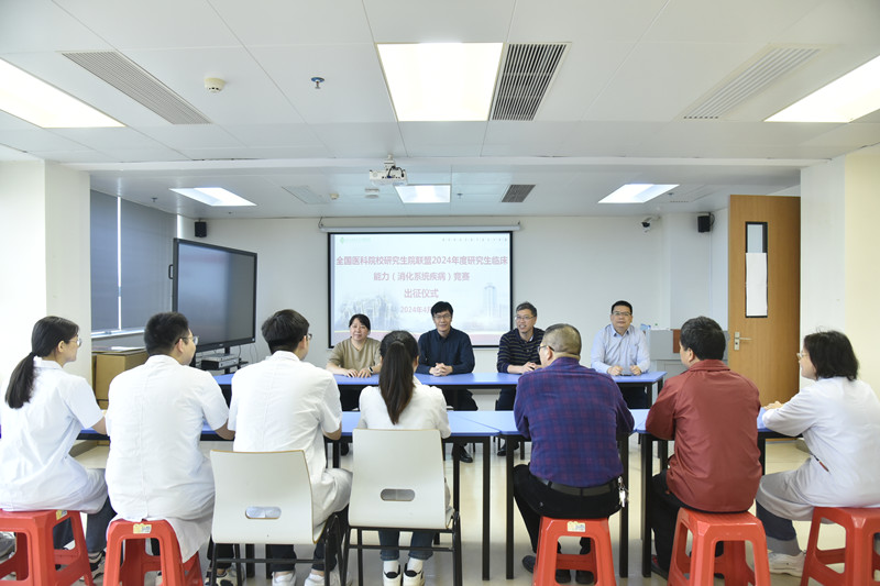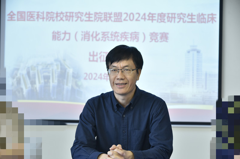 2024年4月8日上午,临床医学院(附属医院)在总院区医技综合大楼14楼大教室举行全国医科院校研究生院联盟2024年度研究生临床能力(消化系统疾病)竞赛出征仪式。解继胜副校长、研究生院院长曾怡和临床医学院(附属医院)副院长潘征、毕业后继续教育管理科科长黄华东出席仪式,临床医学院(附属医院)研究生导师、研究生教学秘书、2022级临床医学专业学位硕士研究生5名参赛选手参加出征仪式。临床医学院(附属医院)副院长潘征主持仪式。