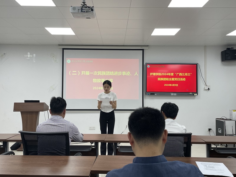 进行一个故事分享,由各党支部进行民族团结进步事迹、人物故事分享,护理学院学生第一党支部黄钰分享壮族“呗侬”黄子荣的故事,护理学院学生第二党支部黄融宜分享瓦氏夫人抗倭事迹,护理学院学生第四党支部吴凤璇分享“时代楷模”鲍卫忠的事迹。