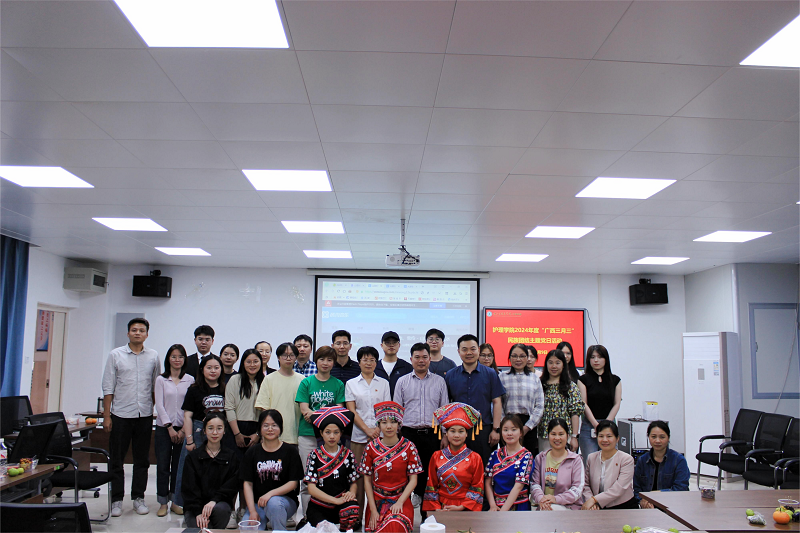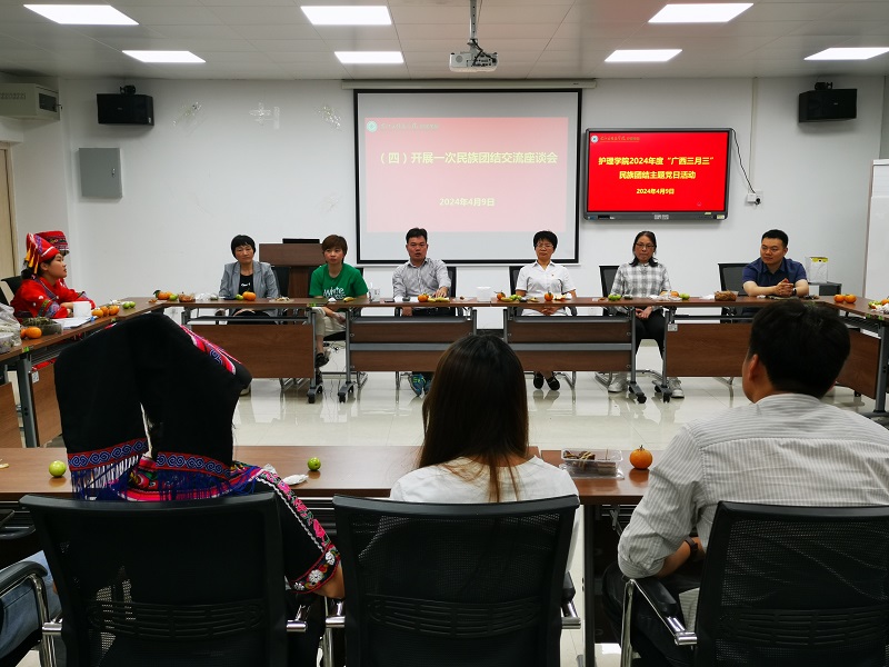 为进一步推动中华优秀传统文化传承发展,进一步巩固全体师生铸牢中华民族共同体意识,护理学院在二楼多媒体教室开展以“民族团结我同行 各族师生一家亲”为主题的“广西三月三”“六个一”民族团结主题党日活动。护理学院教职员工代表及学生代表参加活动。