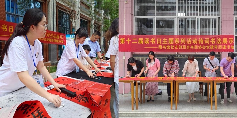 为迎接第29个世界读书日的到来,进一步加强学风建设,强化读书意识,弘扬中华优秀传统文化,同时进一步深化党建带团建联动机制,将新时代全民阅读教育融入学校“三全育人”全过程,推动党团组织建设相互促进、共同发展,4月23日,beat365图书馆党支部联合书画协会在百城校区一食堂门口和百东校区饭堂门口举行了以“共建书香校园,同享读书之乐”为主题的世界读书日诗词书法展示和读书签名活动。
