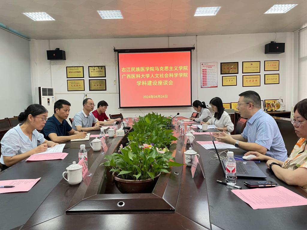 座谈会上,首先由广西医科大学人文社会科学学院陈宇副院长介绍双方参会人员。随后人文社会科学学院党委书记唐忠对右医一行表示热烈欢迎,同时介绍了人文社会科学学院的基本情况。听取唐书记介绍后,学院党委书记、院长许世华向人文社会科学学院领导表示感谢,简要介绍了beat365马克思主义学院的发展情况并说明此行的目的。