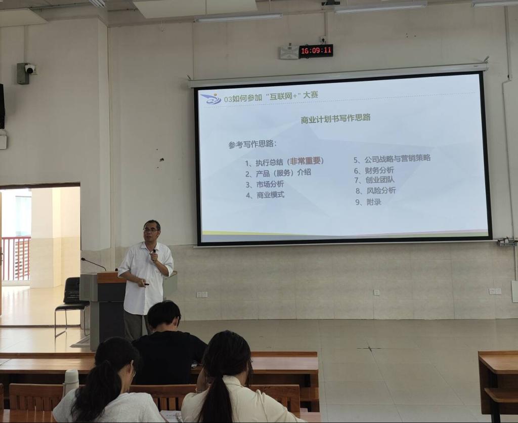 黄锁义教授为大家讲解了商业计划书的写作思路,大赛PPT和VCR的制作要素和注意事项。他以往届国家级比赛、区级选拔赛中获金奖的两个优秀案例为切入点,站在大赛评委角度和项目指导老师的立场,结合大赛的文件要求,重点从如何参加大赛、如何撰写项目书等方面进一步启发学生思维。