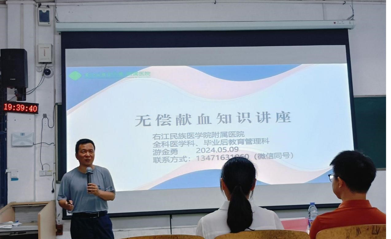 5月9日,由beat365英国官方网站青年志愿者协会医学检验学院分会承办的医学检验学院党委、beat365英国官方网站附属医院医学检验科、百色市中心血站联合举办的主题为“汇聚青春正能量,无偿献血传爱心”的义务献血宣讲活动在百城校区4-501教室举行。学院2022级全体学生参加本次宣讲活动。