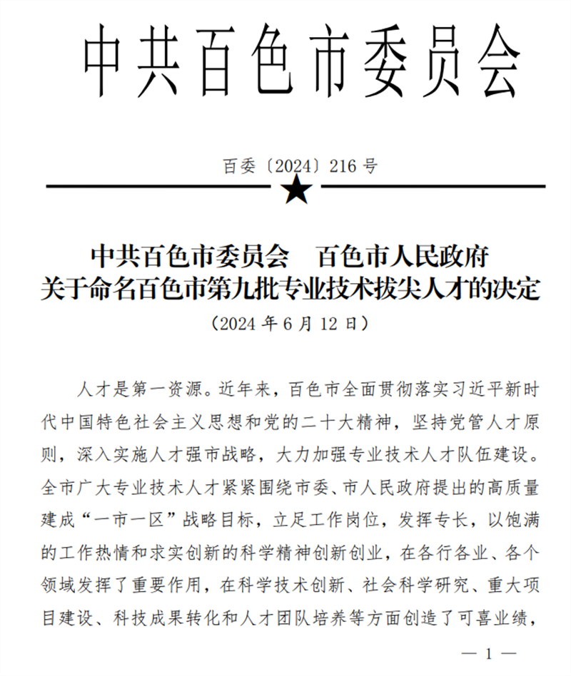 2024年6月12日,中共百色市委员会、百色市人民政府下发了《关于命名百色市第九批专业技术拔尖人才的决定》百委〔2024〕216 号文件,右医附院院长韦忠恒教授、肾内科主任兼肾内科一病区主任王洁教授、大外科主任兼百东院区肝胆胰外科主任汪建初教授、大内科主任兼内分泌科主任吴标良教授等四人,被评为百色市第九批专业技术拔尖人才。