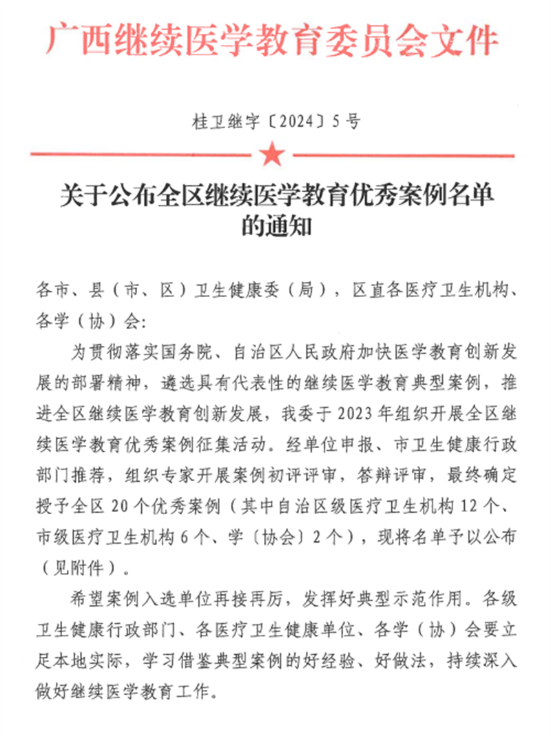 今后,右医附院将继续立足本地实际,继续加强继续医学教育项目的管理和开展,鼓励医护人员积极参与,不断提升自身的专业素养和医疗技能,为患者提供更加安全、有效、便捷的医疗服务,努力让人民群众健康获得感更加充实、更有保障、更可持续,为推进健康广西建设做出新的更大贡献。
