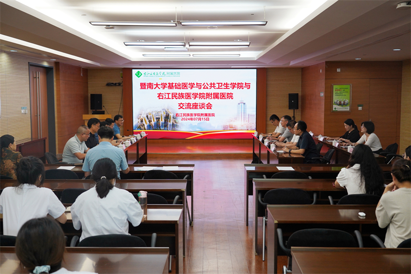 7月15日上午,暨南大学基础医学与公共卫生学院院长陈国兵教授一行8人来到右医附院开展学术交流活动,beat365英国官方网站副校长谭盛葵出席座谈会并致欢迎词,右医附院党委书记黄照河、院长韦忠恒、副院长邓益斌,肿瘤科、神经内科、康复医学科医护人员及在读研究生等参加学术交流活动。右医附院院长韦忠恒主持交流座谈会。