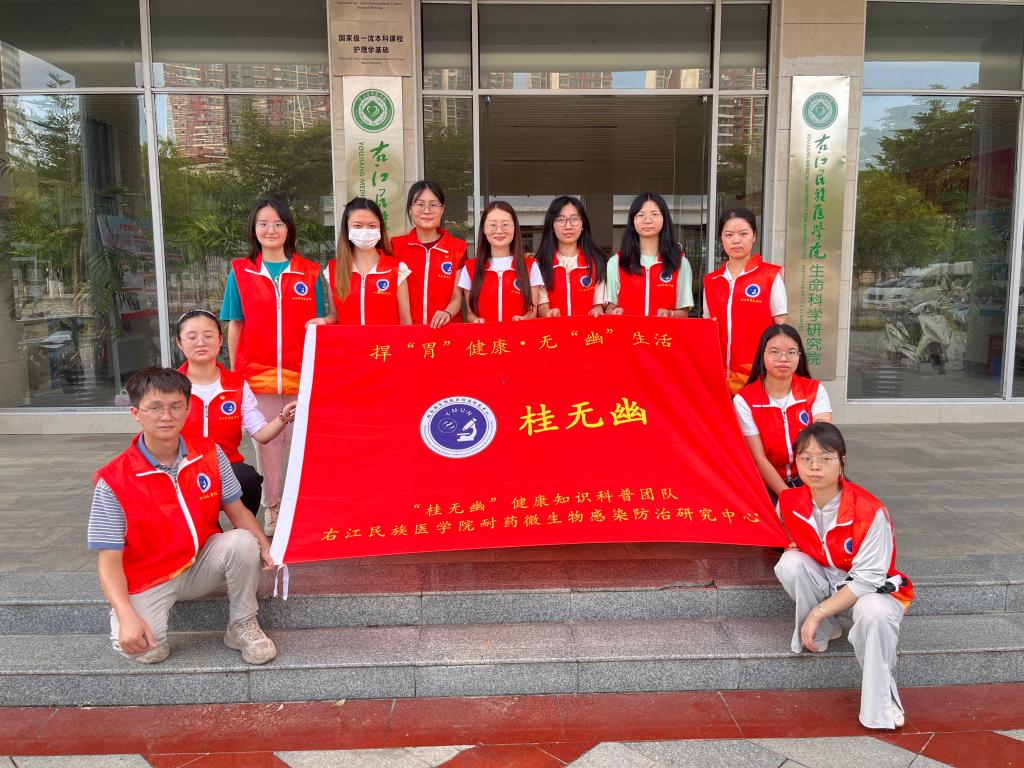 幽门螺杆菌感染是一种常见的慢性细菌感染,它的感染群体存在地域差异,在发展中国家更为普遍,我国感染幽门螺杆菌比例占总人口的41.5~72.3%。为提高大众健康素养和防范幽门螺杆菌感染的意识,2024年7月16日至19日,广西病原微生物耐药防控科技创新合作基地的“桂无幽”公益科普团队,在黄衍强老师的指导下,开展为期四天的公益科普活动。