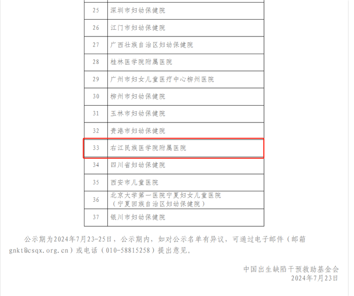 近日,中国出生缺陷干预救助基金会公布了国家重点研发计划“生育健康与妇女儿童健康保障”专项《功能性出生缺陷疾病病因学研究和精准干预及救助体系构建》【项目编号:2022YFC27030600】的功能性出生缺陷精准干预及救助单位评选结果,临床医学院(附属医院)凭借其在医疗技术、科研水平及社会服务方面的优异表现,经过项目课题组专家的严格评审与层层筛选,脱颖而出,成功入选为全国37家功能性出生缺陷精准干预及救助单位之一。作为桂西地区首家的项目医疗救助单位,这一荣誉不仅是对临床医学院(附属医院)长期以来在出生缺陷防治领域不懈努力的充分肯定,更是对其在推动功能性出生缺陷精准医疗与救助体系构建方面作出重要贡献的高度认可。