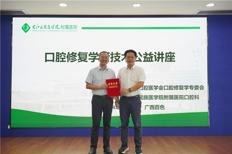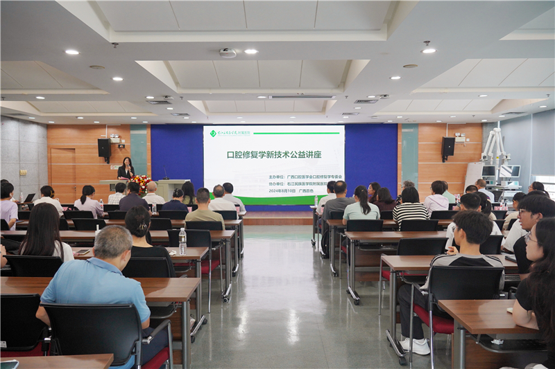 临床医学院(附属医院)韦忠恒院长在致辞中向远道而来的授课专家、学者们表示热烈欢迎和衷心感谢,希望与会的专家、委员和学员们围绕口腔修复的新技术和发展问题展开积极讨论,为桂滇黔三省交界地区的口腔修复学的发展提供更多新技术、新思路、新方法,造福广大老区人民群众。