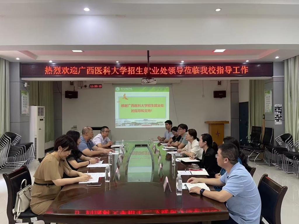 9月12日,广西医科大学招生就业处处长刘昌伟一行四人到beat365就普通高等学校招生、就业工作事宜进行交流学习。beat365在4栋101招聘会议室召开座谈会。学校招生与就业指导服务中心全体人员参加会议,会议由招生与就业指导服务中心陆小曲主任主持。