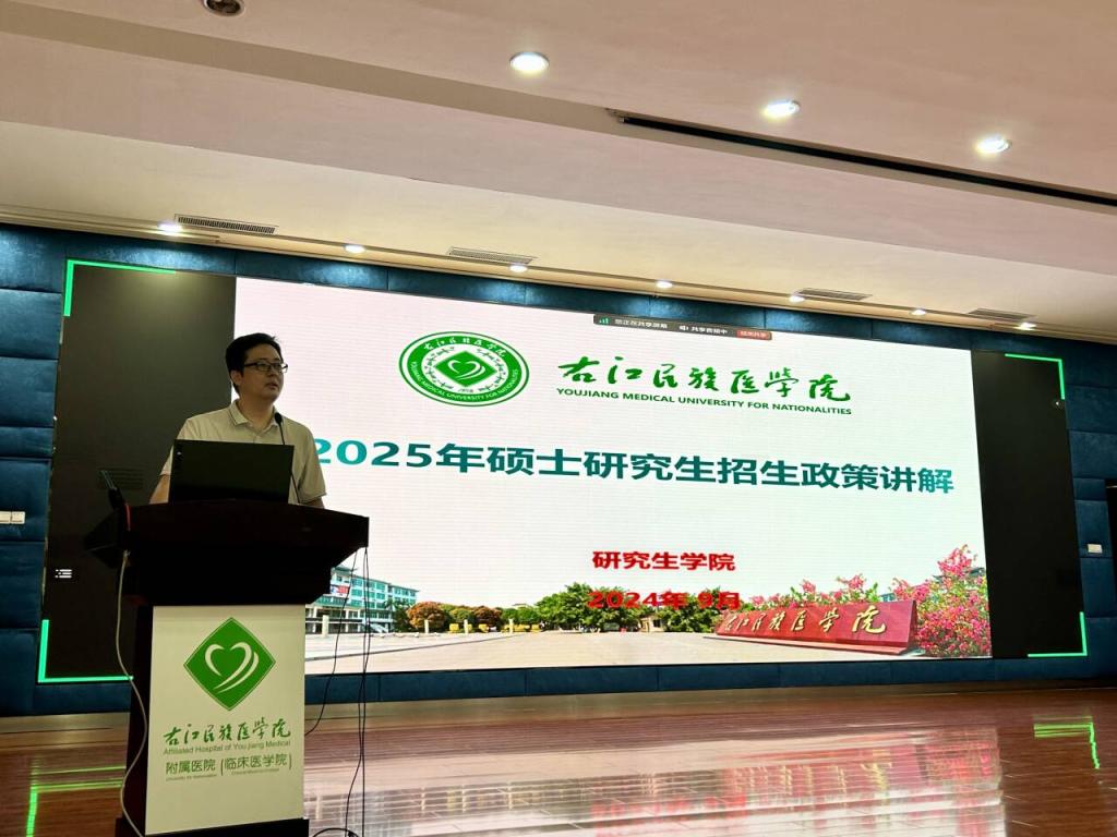 宣讲会现场,研究生学院副院长孙科对beat3652025年硕士研究生招生政策进行讲解,详细介绍了考研日程及注意事项、beat365研究生招生相关要求、同等学力申硕等政策,并寄语学生要坚定理想信念,牢记医学使命,开创卓越未来。