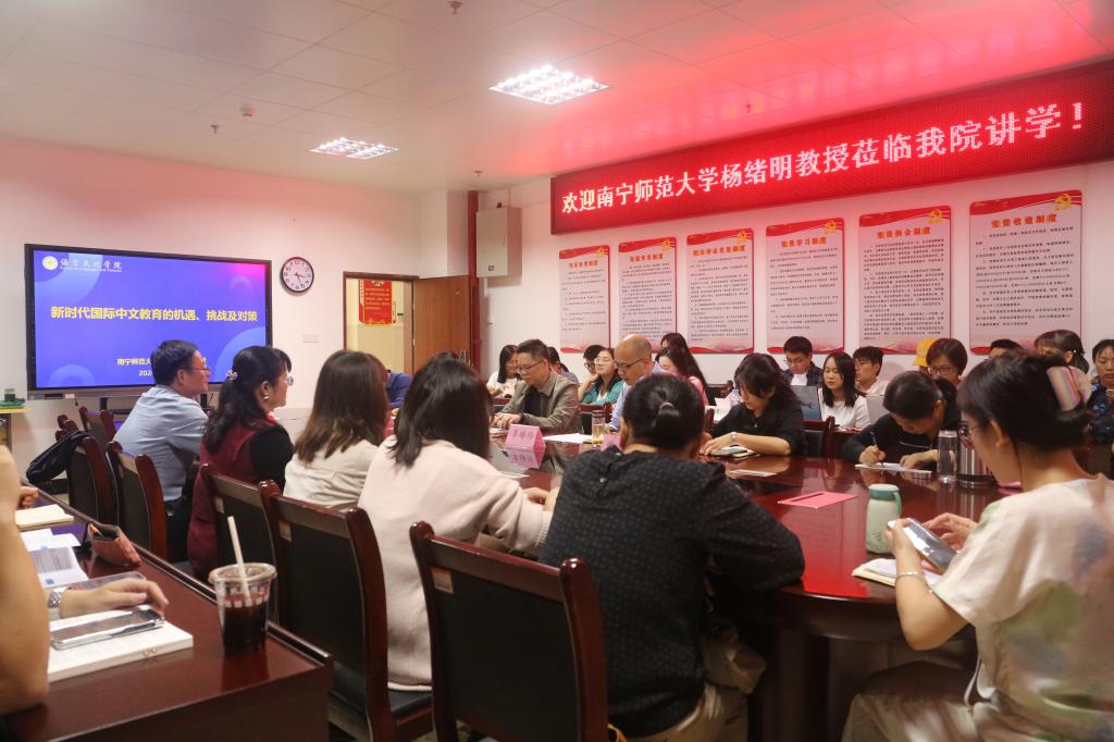 讲座结束后,杨教授与语言文化学院汉语教师进行座谈。杨教授耐心解答了老师们提出的关于国际中文教育方面的问题,分享了他在国际中文教育领域的宝贵经验,并为学院汉语教研室的学科建设与发展提供了建设性意见。