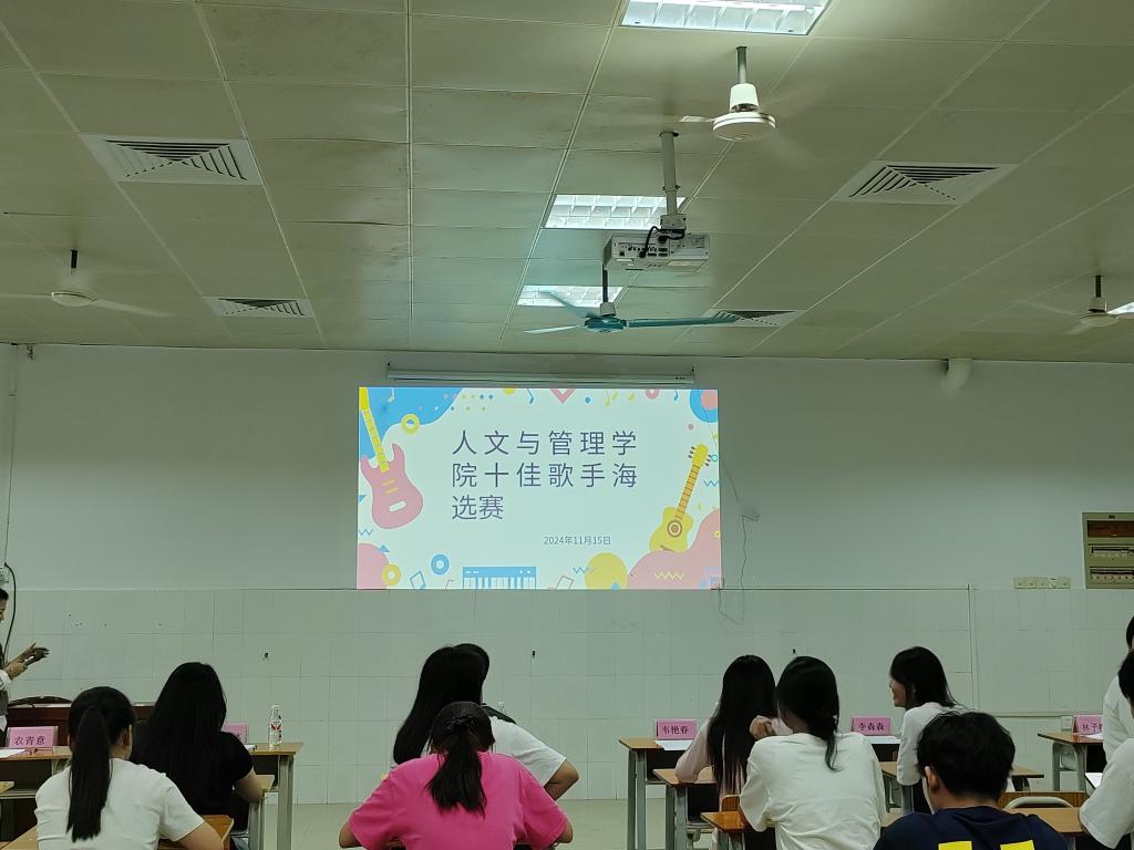 11月15日晚,人文与管理学院在6栋616教室举行2024年校园十大歌手海选赛。此次比赛由人文与管理学院艺术团指导老师李森森主持,院长助理韦艳春老师、党政办负责人岑指昊老师、学生科辅导员赵彬冰老师和艺术团理事林子祺、王梦林受邀出席并担任评委,共有18位候选人参加比赛。