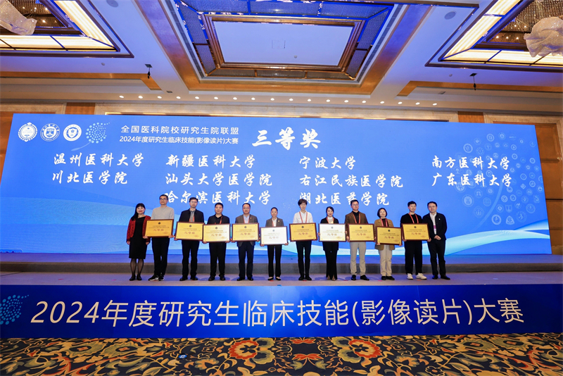 11月23日,由全国医科院校研究生院联盟主办、温州医科大学与温州医科大学附属第五医院(丽水市中心医院)联合承办的“全国医科院校研究生院联盟2024年度临床能力(影像读片)大赛”落下帷幕。此次竞赛共有来自全国43所医学院校的86名放射影像学硕士专业学位研究生报名参赛。经过初赛、复赛、决赛的激烈角逐,右医附院2022级放射影像学专业学位硕士研究生李长禄、林绵磊(导师黄德尤)代表beat365英国官方网站参赛,凭借扎实的技能和出色的表现荣获全国医科院校2024年度研究生临床技能(影像读片)大赛三等奖。
