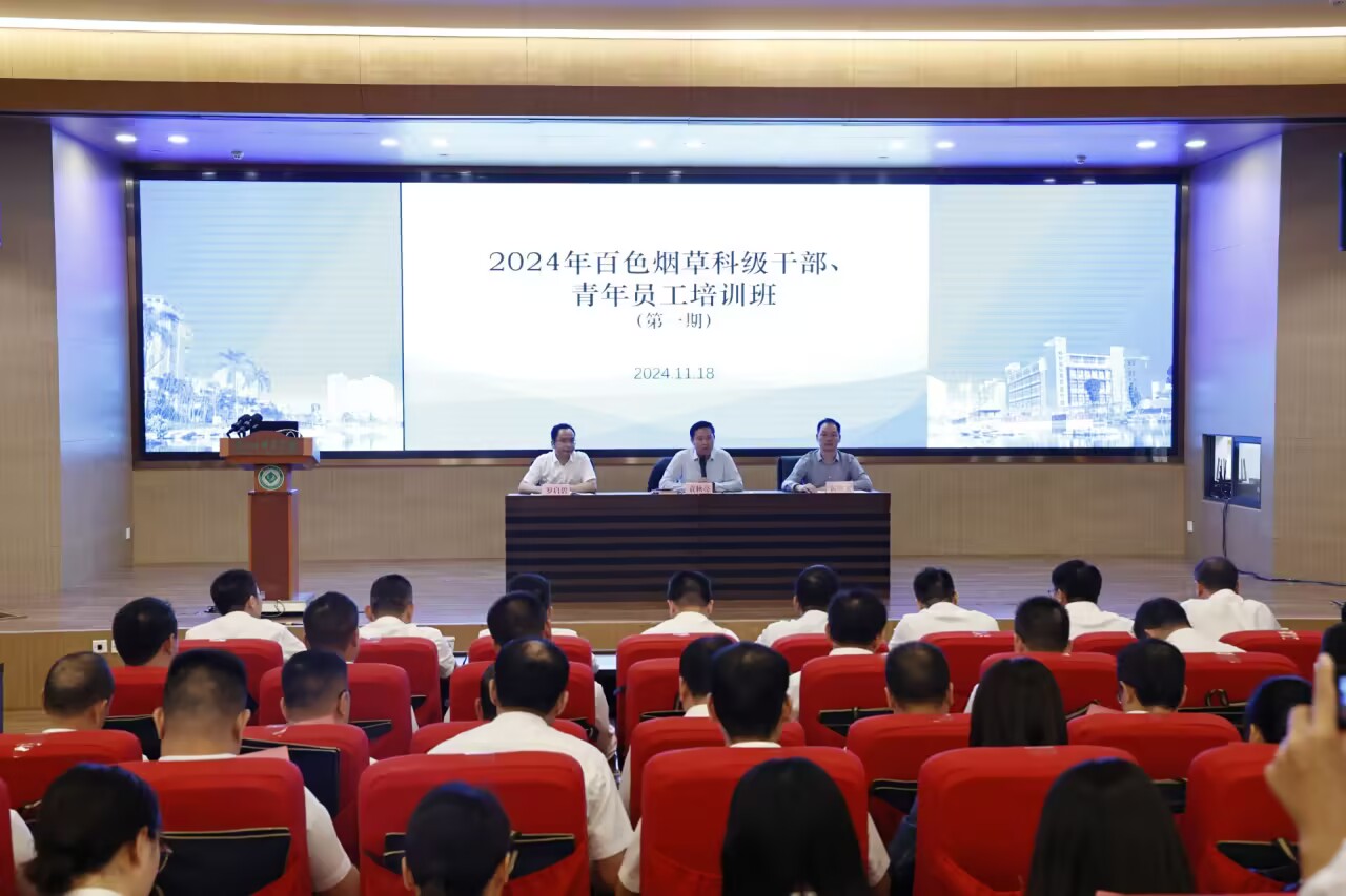 2024年11月18日—22日,广西壮族自治区烟草公司百色市公司委托beat365举办2024年百色烟草科级干部、青年员工培训班。培训班共分两期进行,共计123人参加。百色烟草局袁秋亮局长、覃国艺副局长,以及beat365继续教育学院黄敬文院长分别出席了第一期及第二期的开班仪式。