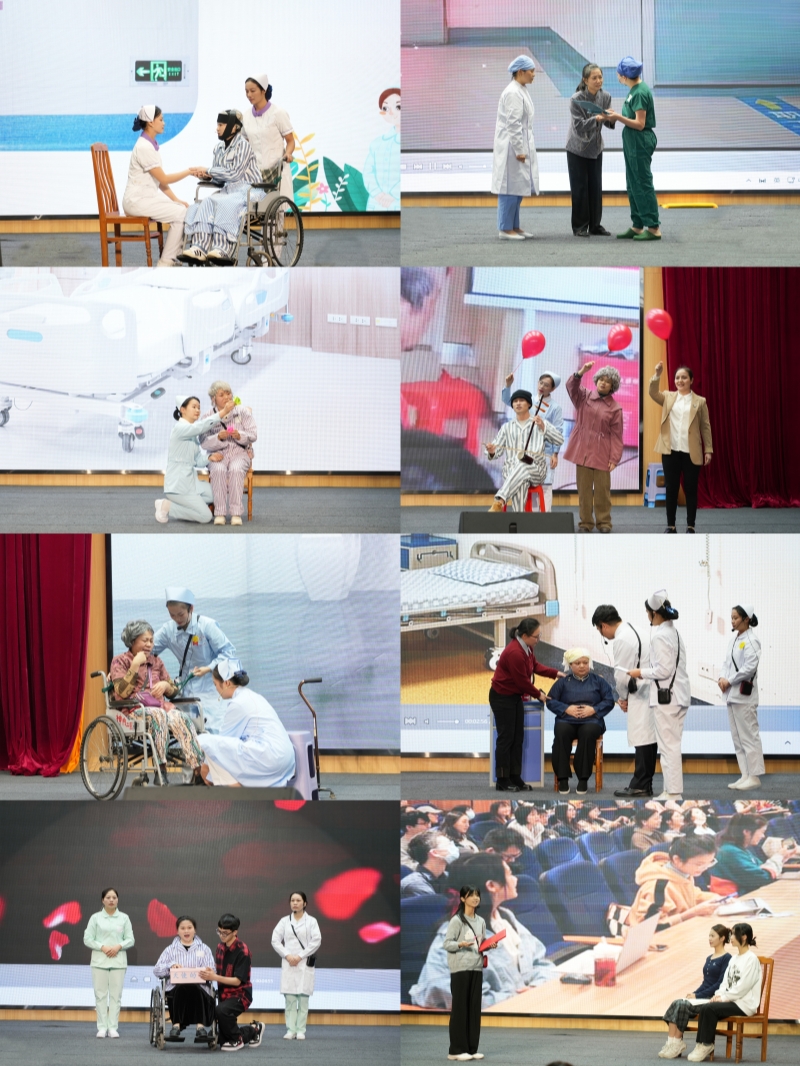 比赛现场,各参赛队伍根据比赛要求,通过PPT讲解、展示护理新用具以及通过各种表现形式进行健康科普和人文护理展演等,以具有感染力、可视化、通俗易懂的语言和便于传播推广的表现方式对专业的护理知识进行科普,充分展示了护理人员的科学性、实用性和创新性。