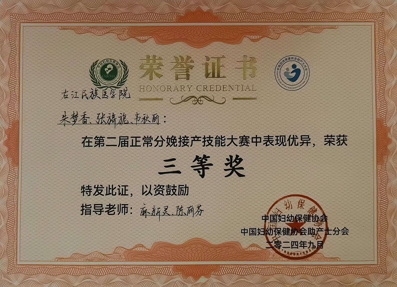 护理学院2021级助产学本科朱梦香、张旖旎、韦秋丽三位同学代表学校参加了中国妇幼保健协会主办的第二届“正常分娩接产技能大赛”,并在众多参赛者中脱颖而出,取得了团体三等奖的良好成绩。其中朱梦香和张旖旎分别荣获个人单项二等奖,韦秋丽获得个人单项三等奖。