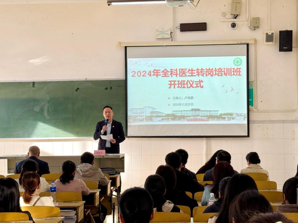 黄敬文在仪式上致辞,他首先对各位学员的到来表示热烈欢迎,并从学校基本情况、培训有关文件、全科医生转岗培训班培训目标及要求等方面做了详细解读,对本次培训的教学计划安排、成绩管理安排、临床轮转实习等事项做了全面介绍。黄敬文指出,结合多年教学经验,学校制定了有针对性的培训计划,精选了有经验的教师,配置了较好的教学设施,能够确保教学质量。