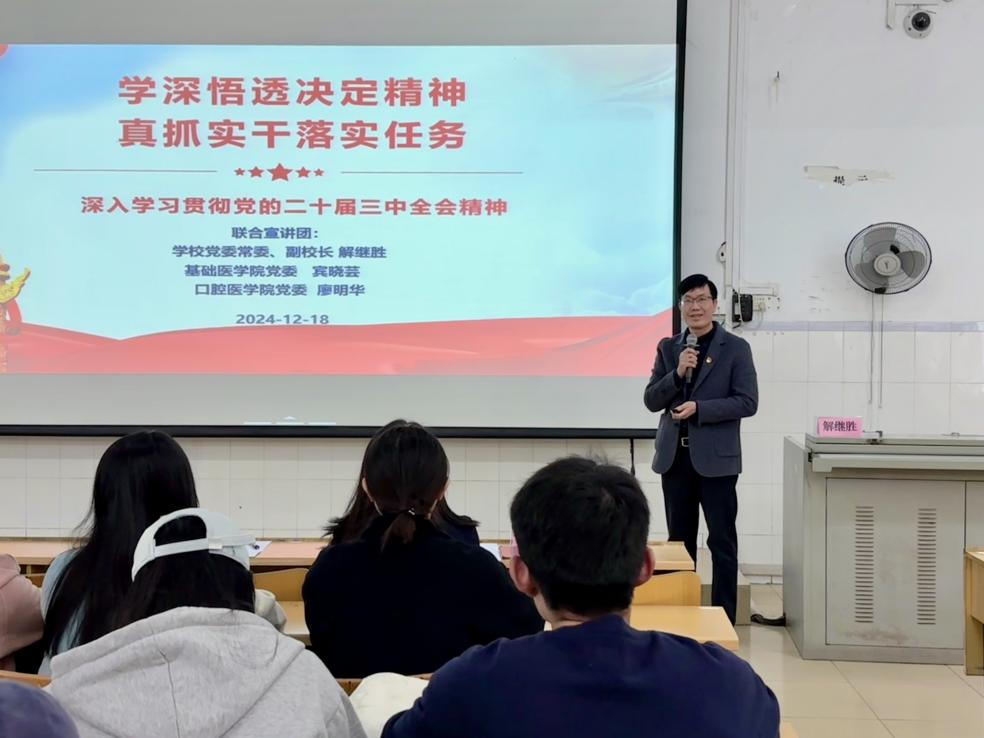 为深入学习贯彻党的二十届三中全会精神,引导同学们深刻领会全会要义,将个人发展与国家战略需求紧密结合,12月18日下午,学校党委常委、副校长解继胜以“学深悟透决定精神,真抓实干落实任务”为主题,为基础医学院、口腔医学院学生带来了一场精彩纷呈且意义深刻的专题党课。