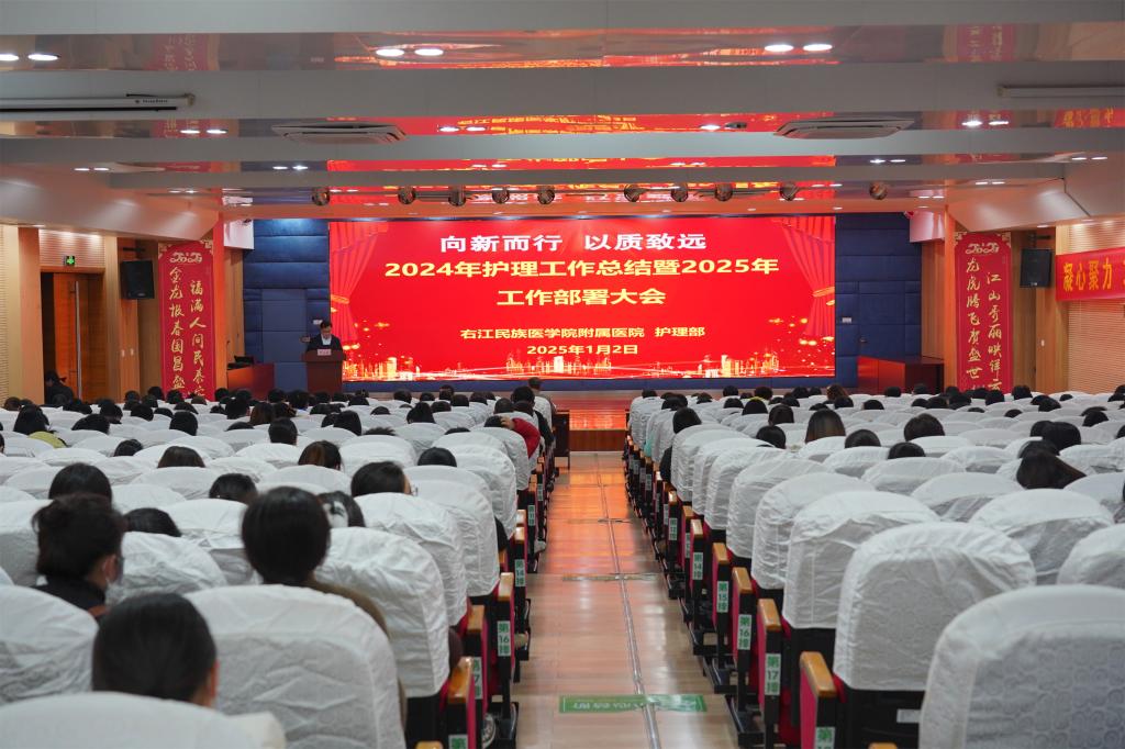1月2日晚,右医附院在总院区学术报告厅召开2024年护理工作年终总结暨2025年工作部署大会,旨在全面总结过去一年的护理成效,谋划新一年的工作计划,激励全体护理人员继续发扬敬业奉献精神,提升护理服务质量。右医附院院长韦忠恒、副院长邓益斌、黄华东、总会计师覃灵艳及行政职能部门负责人、各临床科室主任、护长及护士代表等参加会议。右医附院副院长潘征主持大会。