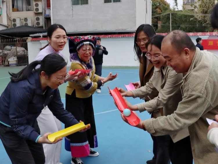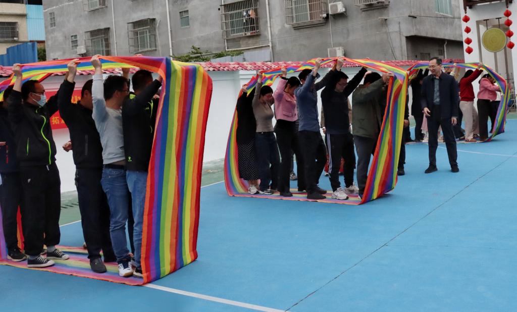 “冬去春来花落花开”和“丢手绢”两个游戏让大家迅速进入状态。“冬去春来花落花开”是让教职工们手腕相拉,随着指令做出各种动作,既活动了身体,又增进了彼此间的互动;“丢手绢”游戏则充满欢声笑语,大家仿佛回到了童年时光,现场气氛轻松愉悦。
