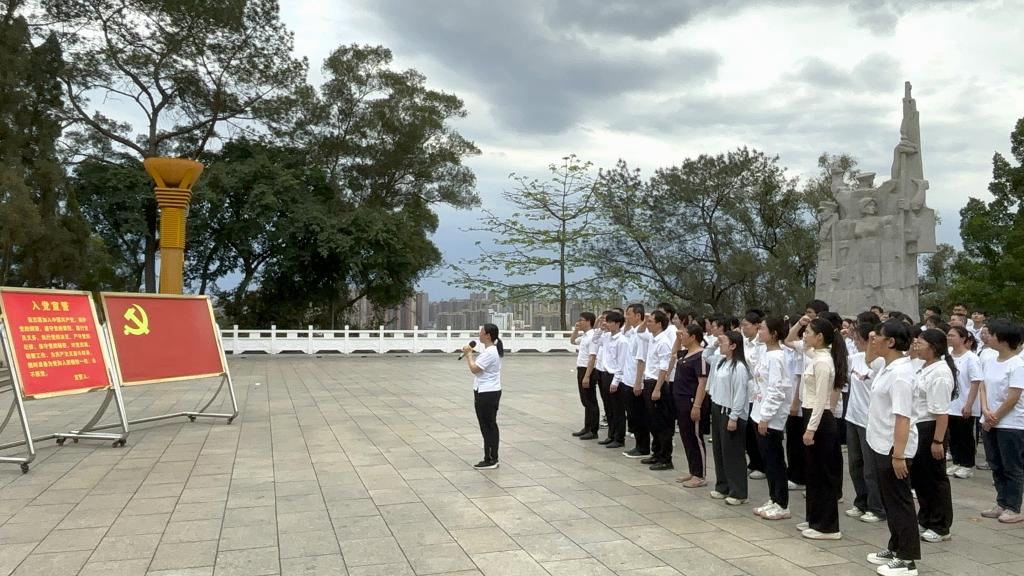 微党课活动结束后,全体师生在绵绵细雨中重走红军桥,前往百色起义纪念碑。在百色起义纪念碑前,教师代表向革命烈士敬献花篮,全体师生向革命烈士默哀三分钟、向革命烈士敬献小白花,新党员进行入党宣誓、老党员重温入党誓词。