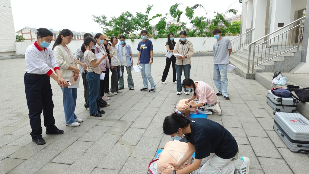 心肺复苏操作过程中,参训师生分组在模拟人教具上进行心肺复苏、人工呼吸及AED设备操作演练,红十字会的老师们俯身为学生演示,逐一指导动作要领,手把手纠正按压手势、调整按压节奏,确保每位学员掌握标准化急救技能。同学们围聚在老师周围,认真观察示范动作,并就心肺复苏操作过程中的疑问及时提问,与老师们形成了积极互动、教学相长的良好氛围。
