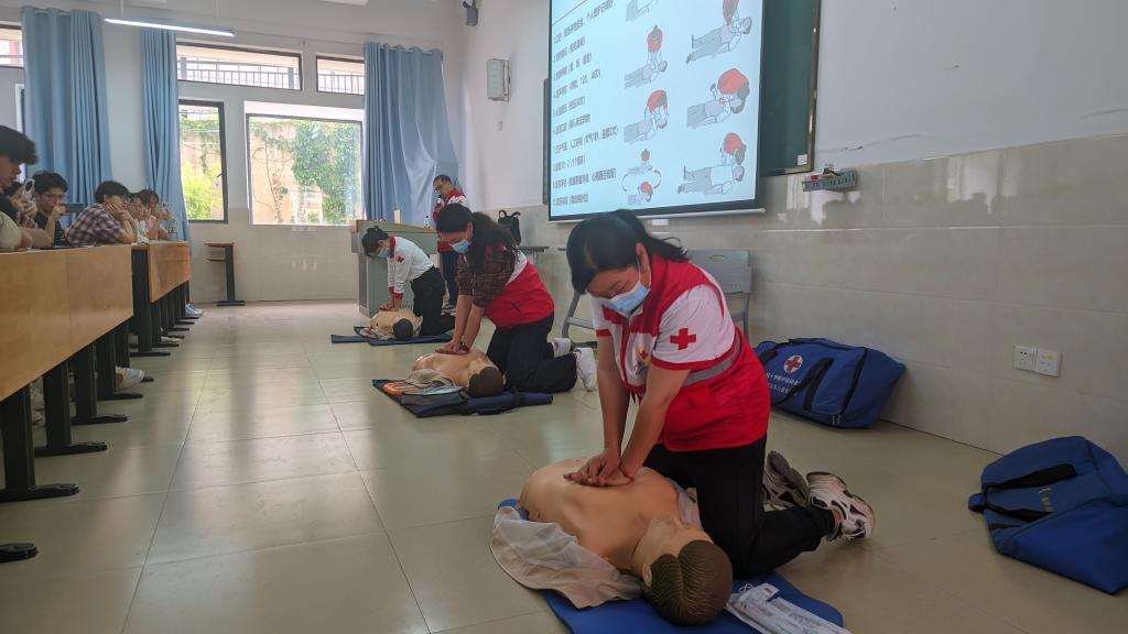 本次培训由百色市红十字会应急救护培训师对同学们进行培训。在理论培训的课堂上,百色市红十字会应急救护培训师从心搏骤停、院外心搏骤停生存链、心肺复苏三个部分为同学们讲解了心肺复苏的重要性以及操作步骤,并现场亲身示范心肺复苏的步骤和方法。培训课堂气氛活跃,同学们积极参与互动并顺利完成心肺复苏(CPR+AED)技能理论答题考试。