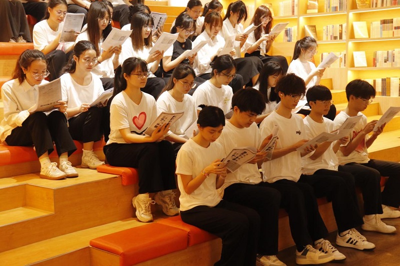 在正式阅读前,现场播放了专题视频,帮助同学们深入理解共读活动的意义与价值。活动伊始,同学们使用手机扫描深圳图书馆提供的电子书二维码,开启沉浸式共读之旅。从《北宋名家词选讲》中领略古典词韵的优雅深邃,感受苏轼、李清照等词人笔下的家国情怀与细腻情感;汲取叔本华在《人生的智慧》中的哲思妙语,思考人生的真谛与处世之道。同学们齐声诵读,声调一致、节奏平稳,朗朗书声在八桂书苑中回荡,实现了与经典跨越时空的对话,让书香与智慧在时空中交融、共鸣,弥漫出独特的韵味。