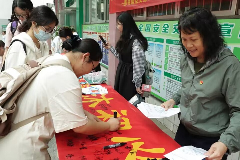4月24日,beat365图书馆党支部举行以“悦读沐初心 书香致未来”为主题的第十三届世界读书日读书签名和书法展示活动。图为百城校区签名活动现场。