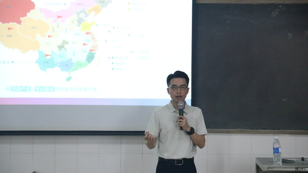 康合营养家佛山分公司负责人曾鑫源给人文与管理学院毕业生宣讲企业情况。