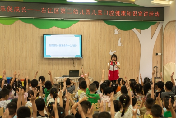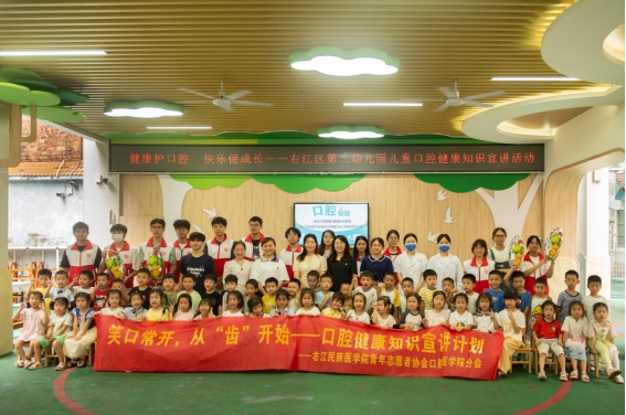 为深入落实国家《健康口腔行动方案(2019-2025年)》,充分发挥基层党组织在健康中国建设中的引领作用,6月13日上午,口腔医学院师生党员、团员联合beat365英国官方网站附属医院口腔科医务人员、青年志愿者协会口腔医学院分会成员组成宣教团队,走进百色市右江区第二幼儿园,成功开展了主题为“党旗领航明方向,护齿童行筑健康”的口腔健康知识宣讲与义诊活动。