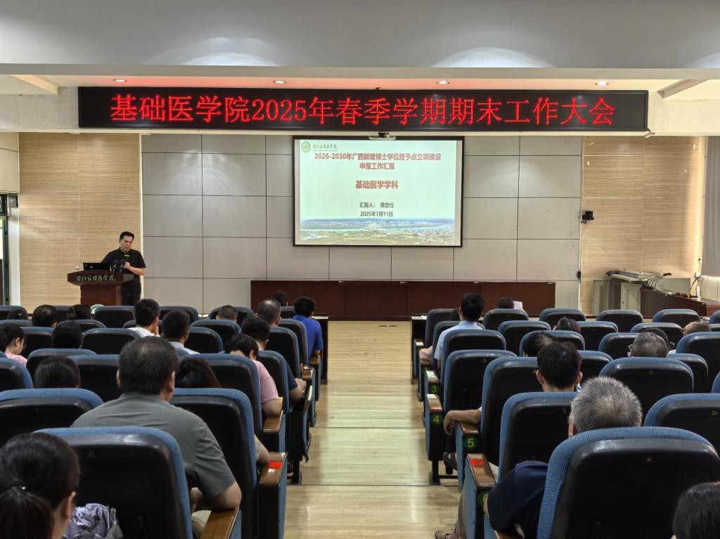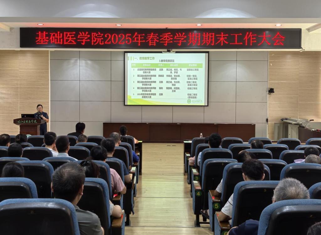 2025年7月11日下午,基础医学院2025年春季学期期末工作大会在百城校区5栋101学术报告厅隆重召开。学院全体教职工参会,会议由副院长王金花主持。